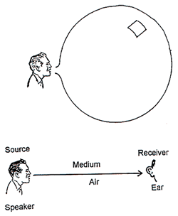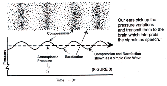 all directions. (Fig 1) For sound to be generated and heard it must have a source, a medium through which to pass and a receiver. For purposes of this discussion we will assume that we are talking about normal speech communications. The source is the speakers voice, the medium through which it is transmitted is air and the receiver is the listeners ear. As sound is generated by the speakers speech, the speakers voice acts like a diaphragm which causes the molecules in the air to pulsate back and forth while moving in all directions, at a speed of 1130 ft per second (770 mph). A single segment of a sound wave may be characterized as pressure compressions and rarefactions. |