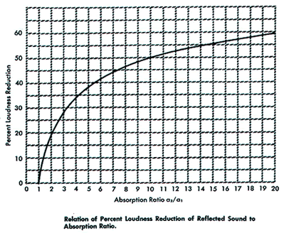 (NR). Sound measured on one side of a wall and then on the opposite side will reflect the sound transmission blocking characteristics of the wall. The difference between the two measurements is described as the Noise Reduction characteristics of the wall. Treating a noisy reverberant space with acoustical materials can reduce the reflected sound build up that occurs due to the reflective hard surfaces. In a"before treatment" and "after treatment" comparison the decibel level can be calculated. This diagram can be used to compare how the sound reduction will be perceived. Example: An existing room with 500 sabines of absorption prior to acoustical treatment that adds an additional 1500 sabins will have a absorption ratio of