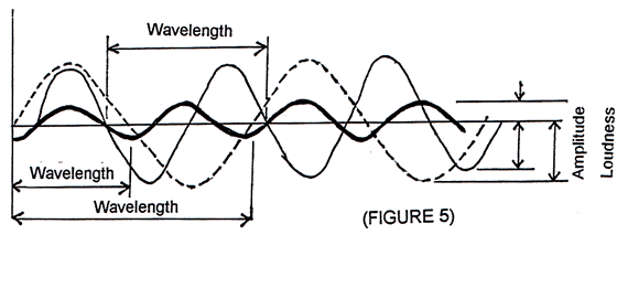| Loudness: (Amplitude or Intensity) is measured by the strength of the sound, depicted as a sine wave above and below the normal atmospheric pressure. (Figure 5) shows the combination of sine waves the sounds at different loudness levels or amplitudes. For the sake of simplicity the sound intensity or pressure levels are measured in decibels. |