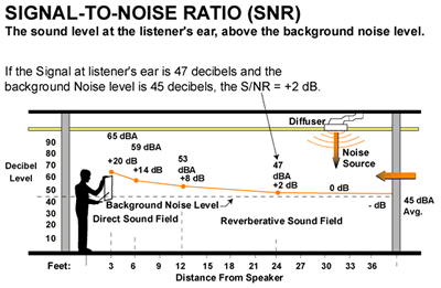 distance, 53 dBA at a 12-foot distance and 47 dBA at a 24-foot distance.![]() A good Signal to Noise Ratio should be not less than +15 dB, that is to say the signal strength should be at least 15 decibels above the background noise level in order to achieve good Speech Intelligibility by the listener. From (Figure 12) it can be seen that beyond a 12-foot distance from the instructor the S/NR is far below what it should be. In a typical classroom the ambient or background noise level in the unoccupied classroom should not exceed 35 dBA with the HVAC system running. |