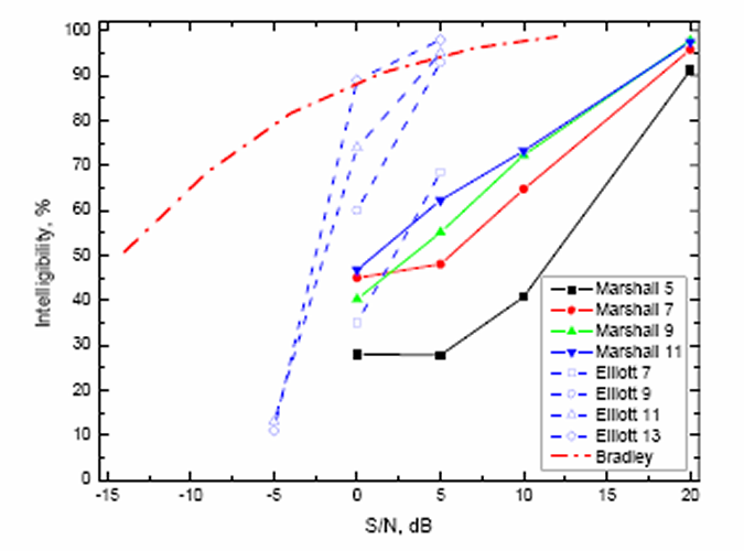 Although the young adults got very high scores for S/N> +1 dB, they still thought they had difficulty in perceiving the speech sounds as indicated by the Difficulty ratings in Figure 5. These are the results of a third test that the young adult subjects performed in the simulated sound fields in which they gave subjective ratings of the Difficulty of understanding speech material [11]. In the range of S/N values from +1 to +20 dB, where the younger students show increasing intelligibility scores, the adults expressed decreasing difficulty. Thus, the adults have developed the skills to understand speech in more difficult conditions but they still require extra effort to do this and they find it more difficult to listen in these conditions where there are less than ideal S/N values. It is not clear how children would rate the Difficulty of the same situations because only young adults were tested. 4. Room Acoustics Effects It was hoped that the selection of classrooms would include significant variations in room acoustics characteristics. Unfortunately this was not the case and mid-frequency reverberation times varied only between 0.3 and 0.7 s for the occupied classrooms [10]. As a result, initial analyses of possible relationships between speech intelligibility scores and room acoustics parameters were inconclusive. For example, when the speech intelligibility scores were plotted versus A weighted Useful-to-Detrimental sound ratios, the resulting relationships were no better than those in Figure 2. Because S/N was deliberately manipulated over about a 40 dB range it had by far the dominant influence of speech recognition scores. 5. Conclusions The results of the speech intelligibility tests in classrooms with grade 1, 3, and 6 students show clear effects of the age of the students. Grade 1 students are seen to require, on average, conditions with 7 dB better S/N than grade 6 students to achieve the same 95% correct speech intelligibility scores. Young adults had, on average, substantially better speech intelligibility scores than the students for conditions with the same S/N value. While the adults obtained higher speech intelligibility scores, they still expressed difficulty in understanding the speech for the conditions of less than ideal S/N values. It may be that young students would have even higher levels of difficulty than the adults. The young adults were tested in more ideal laboratory conditions without the additional distractions of real classrooms. Further experiments are required to more completely connect the results for the young adults with those for the students. The measurements of S/N values in these classrooms during normal teaching activities had a mean S/N of 11 dB [10]. For this average condition, the grade 1 students would understand only 92% of the teacher's speech. Of course, a significant number of the grade 1 students would understand much less than this average. The grade 3 students would perform only 2% better. Clearly many common classroom situations do not provide ideal acoustical conditions where younger students can understand all that is said by their teacher. 6. Acknowledgements The authors are grateful for the financial support and collaboration of the Canadian Literacy and Language Research Network and for the help of Ms. Kimberlee Cuthbert in carrying out these experiments. They are also very appreciative of the help of the audio group at the Banff Centre for their help in editing the speech recordings. 7. References [1] Elliott, L.L., "Effects of noise on speech by children and certain handicapped individuals," Sound and Vibration 16, 10-14, (1982). [2] Elliott, L.L. "Performance of children aged 9 to 17 years on a test of speech intelligibility in noise using sentence material ~ with controlled word predictability", J. Acoust. Soc. Am., 66,651-653 (1979). [3] Marshall, N.B., "The effects of different signal-tonoise ratios on the speech recognition scores of children", Ph.D. Thesis, University of Alabama, Tuscaloosa Alabama, (1987). [4] Nabelek, A.K., and Pickett, J.M., "Reception of onsonants in a classroom as affected by monaural and binaural listening, noise, reverberation andhearing aids," J. Acoust. Soc. Am. 56, 628-639, (1974). [5] Finitzo-Hieber, T, and Tillman, T.W., "Room acoustics effects on monosyllabic word discrimination ability for normal and hearing impaired children," J. Speech Hear. Res. 21, 440 - 458, (1978). [6] Bradley, J.S., Sato, H. and Picard, M., "On the importance of early reflections for speech in rooms", J. Acoust. Soc. Am. 113 (6) 3233-3244 (2003). [7] Carhart, R., Tillman, T.W., Greetis, E.S., "Perceptual masking in multiple sound backgrounds", J. Acoust. Soc. Am. 45, 694-703 (1969). [8] Bradley J.S., "Speech intelligibility studies in classrooms", J. Acoust. Soc. Am., Vol. 80, No. 3, 846-854, (1986). [9] Ross, M., and Lerman, J., "A picture identification test for hearing-impaired children", J. Speech and Hearing Research 13, 44-53 (1970). [10]Sato, H. and Bradley, J.S., "Evaluation of acoustical conditions for speech communication in active elementary school classrooms", Proceedings of ICA, Kyoto (2004). [11] Sato, H., "Subjective measures to evaluate speech intelligibility, quality and difficulty in rooms for young and elderly listeners", Canadian Acoustics, 30 (3) 50-51 (2002). |