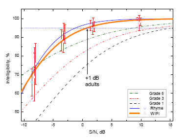 Figure 4 shows the results of baseline speech tests using young adult listeners in simulated sound fields intended to be representative of conditions found in classrooms. The young adults performed both the WIPI test and the Rhyme test so that the current results using the WIPI test could be compared with various older studies that have used the Rhyme test. Figure 4 also includes the best-fit regression lines to the new classroom results from Figures 2 and 3. The test results for young adults show mean scores that are clearly better than those for the grade 6 students at most S/N values. This is partly due to age differences between the adults and the grade 6 students and is also probably influenced by the different test conditions. The laboratory tests of the adults did not include some factors present in the classroom tests such as the distractions of other students. The young adults have a mean score of 95% correct at a S/N value of +1 dB, which is a considerably lower S/N than for the students.