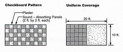 The efficiency of a sound-absorbing material can be affected by its distribution and location in a room. For example, 25 panels of sound-absorbing material, each 2 ft by 2 ft, will absorb more sound energy per panel when spaced in a "checkerboard" pattern on a 200 sq ft plaster ceiling than a uniform coverage of the same material. This increase in efficiency (called the area effect) is due to the diffraction of sound energy around the perimeters of the spaced sound-absorbing panels and to the additional sound absorption provided by the exposed panels' edges. The efficiency of sound-absorbing panels increases as the ratio of the perimeter to surface area increases. The 25 spaced absorbers have a ratio of perimeter to surface area 5 times the ratio for the 25 uniform-coverage absorbers. Sound energy reflected from the hard-surfaced plaster adjacent to the absorbent edges in the checkerboard configuration tends to spill over onto the sound-absorbent panels. Therefore, the spaced absorbing material absorbs more sound energy than would be accounted for by its area. This kind of surface treatment also can be used to achieve a diffuse sound field, which is desired in music practice rooms. Note that the total absorption contributed by spaced absorbers in this example will be only slightly less than the absorption provided by coverage of the entire 200 sq ft ceiling.
