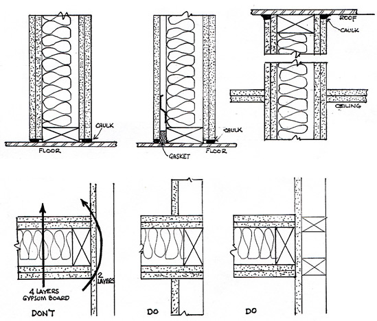 DESIGN AND BUILDING CODES As we came on-line with our new and improved web site and the new feature “What’s Your Problem?” we have been overwhelmed with inquiries about noise and acoustical problems. Not the least of these inquiries have been from owners or renters in condominiums, town houses, apartments and offices. The problems range from noise transmission through floor/ceiling assemblies, through adjacent party walls between neighboring units or through windows. The noise problems associated with floors and ceilings range from airborne noise transmission from voices TV’s and music to footfall impact noise and from plumbing noise. Sad to say, for newer residential units many of the problems could have been prevented in the first place had a little more attention been paid to noise control during the design and construction process. After the fact, when the noise problems are discovered, solutions can be very difficult and expensive to resolve and in most cases there is no easy solution. For newer or remodeled multi-family dwelling units, the various Building Codes throughout the United States require a measure of sound privacy between multi-family dwellings. The Building Codes specify a minimum architectural design standard of privacy of 50 STC (Sound Transmission Class) and a 50 IIC (Impact Isolation Class). The Building Codes also state that validation of the minimum noise criteria can be field measured and the field measurements shall not be less than a 45 FSTC or a 45 FIIC. While some community building inspection departments require field-testing to be conducted before a certificate of occupancy is issued, many, if not most, do not. They rely instead on the architect’s specification and design recommendation and the expectation that their specified designs will result in the minimum sound isolation construction between adjacent units. Unfortunately, what is specified by the architect and what is subsequently built do not always coincide if proper attention and inspection oversight is not implemented. If your residential dwelling is relatively new or if you are contemplating the purchase of a unit, do not be afraid to question the contractor and the real estate agents about the sound isolation characteristics of the unit. Just because they say that the units have been built to code requirements does not mean that they meet the minimum code requirements. If they do not, you may have a case to demand corrective action at the expense of others. Do not be left holding the bag; moreover a certificate of occupancy by local building inspection departments implies that the structure has been built to minimum code standards. Purchasing a condo or townhouse may be one of the most significant expenditures you will undertake; therefore you have every reason to expect answers with respect to your privacy needs and freedom from intrusive noise from your neighbors. If you have a noise problem that is not resolved and you go to sell your unit, you may be compelled to reveal the deficiency to a prospective buyer which can have an impact on the selling price. Very few, if any inspection agencies actually check the quality of construction from a sound isolation perspective and too few building contractors are really conversant with good noise control construction techniques. As a typical example of what can go wrong, take a party wall between two side-by-side units. The wall may have been designed for a 60 STC value but when the installing drywall installs the gypsum board, many of them will jack the gypsum board up tight to the ceiling to insure a nice clean and tight joint at the ceiling line. While there is nothing wrong with this practice, far too often it will leave a void at the floor line, which will eventually be hidden by the baseboard. Any voids at the floor line must be caulked. The wall selected from the gypsum drywall design guide to achieve a 60 STC was selected from the gypsum manufacturer’s design guide based on actual acoustical laboratory tests. Close inspection of the acoustical test data is bound to reveal that in the test chamber the wall was caulked into the test opening to prevent any sound leakage. If this is not repeated in the field during actual construction, sound leakage can and far too often, will occur. The lack of a few pennies worth of caulking compound can reduce the sound performance of a 60 STC rated wall to less than the minimum of FSTC 45 required by the building code. There are many causes for sound leaks, such as uneven floors, wooden floor plates that are not perfectly straight; no matter what the cause, they can all be sealed to insure an airtight barrier thereby maximizing the acoustical performance of the wall. WALLS Fortunately, airborne sound leakage can be easier to detect; as one can do so by getting close to the wall, albeit on all fours and listening for the sound coming through the wall. You may need the cooperation of your neighbor by playing a radio next door so that you have a sound signal to listen for. The sound will become louder as you get closer to the leak. If the sound appears to be coming from the base area a solution maybe is at hand by removing the base to see if the gypsum board and the floor were caulked. If not, caulk it. If the floor is carpeted, the baseboard will normally be positioned just above the carpet, in which case it is possible to insert a probe such as a long flexible knife blade. If the blade goes in more that about 3/8” or if it hits something hard or does not come out with any caulking residue on it, there is a good chance the wall was not caulked as required by the gypsum board manufacturers literature. Equally important, party walls that extend to the roof or floor structure above the drywall ceiling in a dwelling unit should likewise be fully sealed. Just because it cannot be seen following construction and subsequent occupancy is no reason to believe that an unsealed wall is not going to create nois