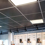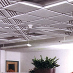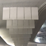 Description: These baffles are fabricated with a rigid 6-7# density fiberglass board and are usually made by adhering two 1" or two 2" thick boards on either side of a few mounting brackets. We can make any size up to a 4' x 10' baffle. These are usually installed in rooms without fire suppression sprinklers and rooms that have very high ceilings.